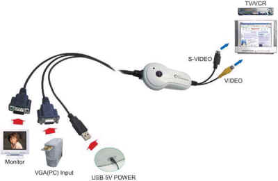 The PC to Video Cable is a one-piece PC-to-TV converter recommended for presentations, computer gaming, and internet browsing on TV.